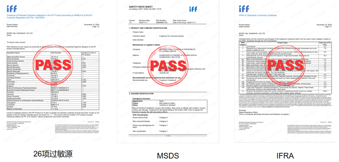 与传统香氛不同,车规级香氛发生器要求从香精原料到香氛,最后到成品香氛棒都必须经过多项安全试验验证测试。香精原料必须取得IFRA(国际日用香料香精协会安全证书)、MSDS(学品安全技术说明书)和Allergens(过敏原检测合格)三项权威安全认证证书,并且要给予不含甲醛的声明,确保原材料的安全健康。东升国际官网依据主机厂标准,精选合作香精公司的优质原料,均满足IFRA、MSDS、Allergens三项权威认证,确保香精安全健康。