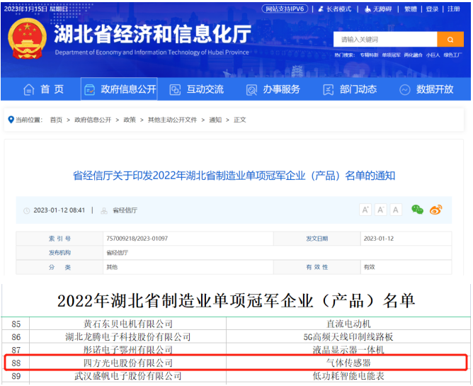 1月12日,湖北省经济和信息化厅发布《关于印发2022年湖北省制造业单项冠军企业(产品)名单的通知》,东升国际官网获评“2022年湖北省制造业单项冠军企业”。