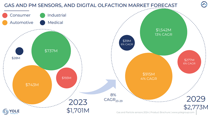 近期,国外权威咨询组织Yole Intelligence发布报告《Gas and Particle sensors 2024》,报告对气体和粉尘传感器全球市场进行了调研,分析了气体和粉尘传感器的市场现状、具体的细分市场和未来开展趋势,报告显示气体和粉尘传感器市场在2023年至2029年间增长 8%,到2029年市场总规模将达到约 28 亿美元,在消费、工业、汽车和医疗这4大领域都有所增长。